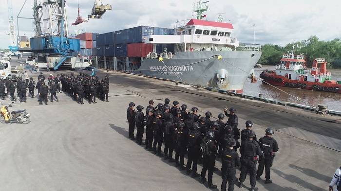 Personil Polda Riau tampak dikerahkan untuk mengawasi kedatangan logistik pemilu di pelabuhan.