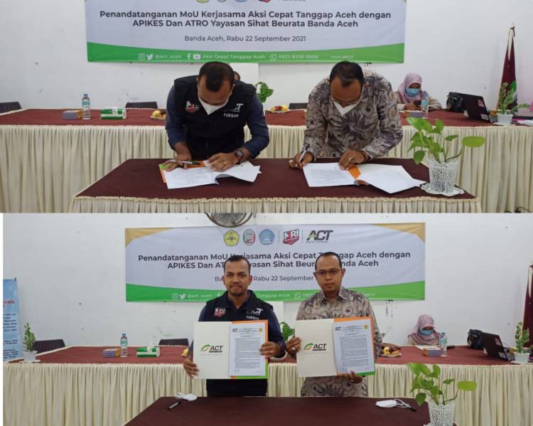 ACT Aceh melakukan penandatanganan MoU Kerjasama Kemanusiaan dengan APIKES dan ATRO Yayasan Sihat Beurata dalam program penyaluran donasi, pengisian mata kuliah tentang wakaf, Dunia Kemanusiaan dan Kerelawanan untuk Mahasiswa (22/9/2021).