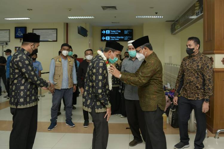 Asisten Administrasi Umum Sekda Aceh Dr. Iskandar AP, M.Si mengalungkan bunga saat menyambut kepulangan Kafilah Musabaqah Tilawatil Qur’an Korpri Aceh.