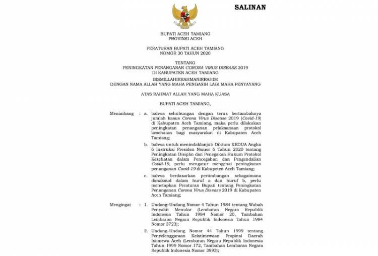 Seperti diketahui, tetbitnya Perbup Nomor 30 Tahun 2020 ini di tengah masyarakat Aceh Tamiang dimaksudkan sebagai pedoman pemangku kepentingan dan seluruh masyarakat agar mematuhi protokol kesehatan Covid-19.