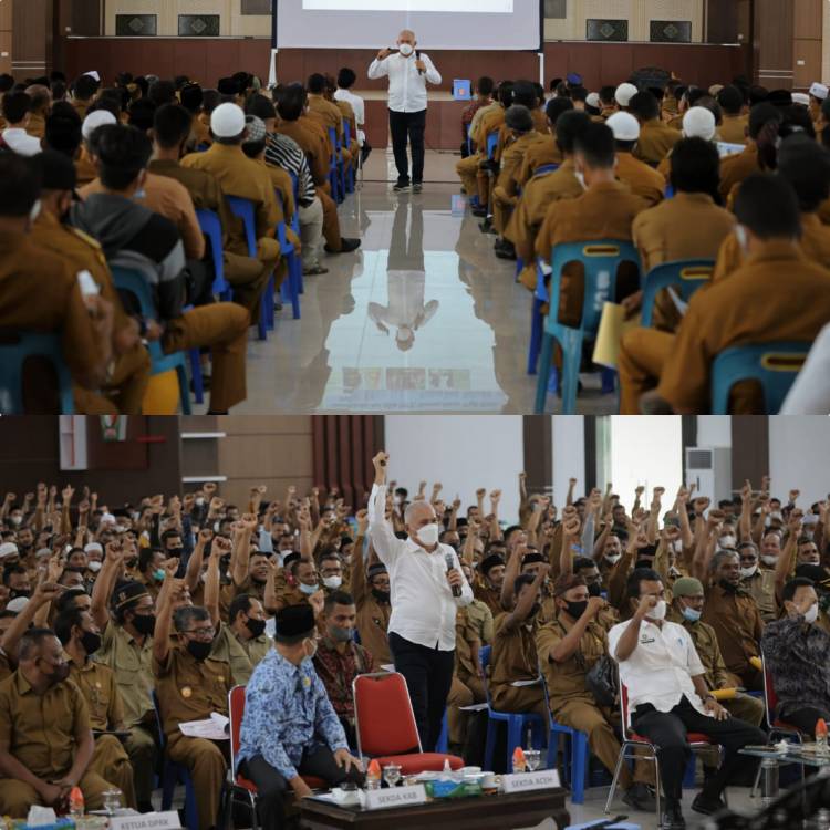 Sekda Aceh, dr. Taqwallah, M. Kes didampingi, Kadinkes Aceh dr.Hanif, Plt.Kadis DPMG Aceh, Dr. Zulkifli, Sekda Kabupaten Pidie, Idhami, S.Sos MSi, dan Unsur Forkopimda Kabupaten Pidie lainnya, memberikan arahan terkait Percepatan Vaksinasi Sekali