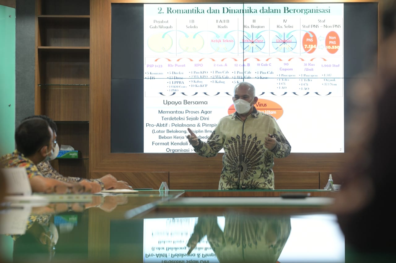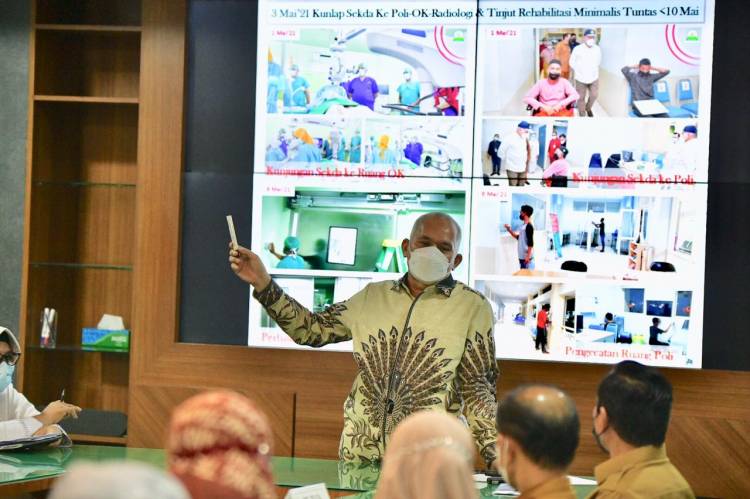 Sekretaris Daerah Aceh, dr. Taqwallah, M. Kes memberikan arahan khusus Revitalisasi Kinerja Pelayanan Rumah Sakit Umum Daerah dr. Zainoel Abidin di Ruang Rapat Sekda Aceh, Banda Aceh, Senin, (17/5/2021).