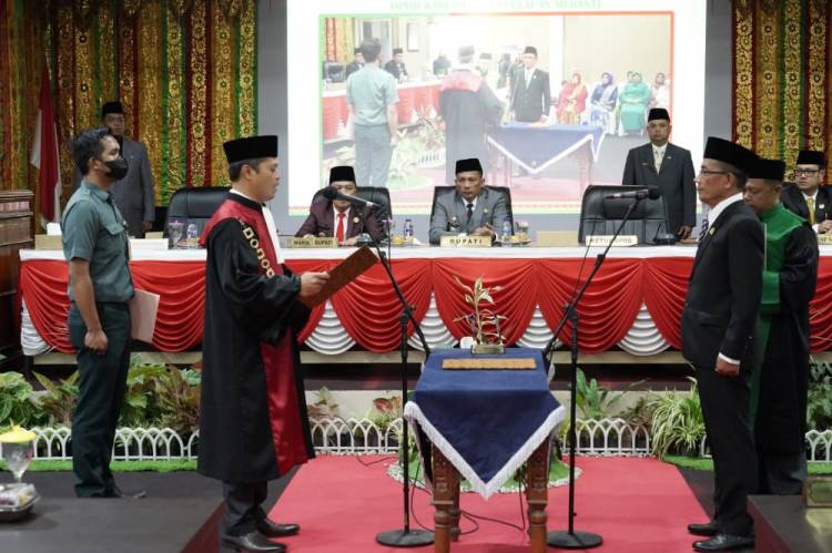 KEPULAUAN MERANTI, datariau.com - Bupati Kepulauan Meranti H Muhammad Adil SH MM didampingi Wakil Bupati H Asmar, menghadiri Rapat Paripurna DPRD Kepulauan Meranti dengan agenda Pengucapan Sumpah atau Janji Pengganti Antar Waktu (PAW) Ketua DPRD Kabupaten Kepulauan Meranti sisa masa jabatan 2019-2024, dari Partai Amanat Nasional atas nama Fauzi Hasan SE MIKom, Rabu (20/7/2022) oleh Pengadilan Agama Bengkalis.