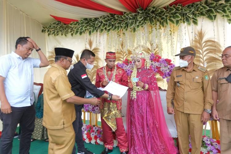 PULAU MERBAU, datariau.com - Bupati Kepulauan Meranti H Muhammad Adil dan Dinas Kependudukan dan Pencatatan Sipil (Disdukcapil) menjadi bagian dari kebahagiaan pernikahan Ernita dan Gunawan di Desa Renak Dungun, Kecamatan Pulau Merbau.