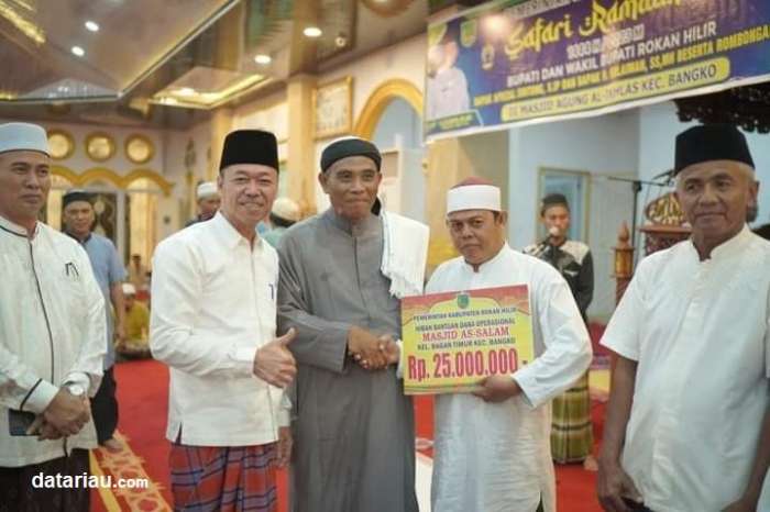 Bupati Rohil saat menyerahkan bantuan untuk masjid dalam agenda Safari Ramadhan di Masjid Agung Al-Ikhlas Kecamatan Bangko.