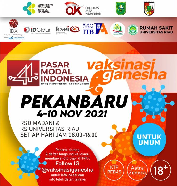 PEKANBARU, datariau.com - Ikatan Alumni Institut Teknologi Bandung (IA-ITB) bekerjasama dengan Pemerintah Kota (Pemko) Pekanbaru menyelenggarakan Vaksinasi Ganesha HUT ke-44 Pasar Modal Indonesia.