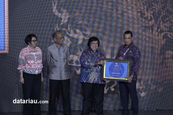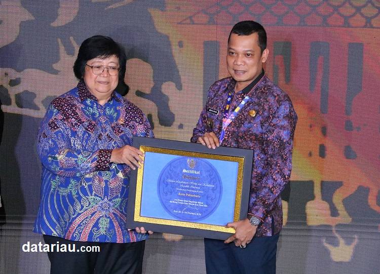 Pj Walikota Pekanbaru Muflihun SSTP MAP saat menerima Sertifikat Adipura dari Menteri LHK RI Prof DR Siti Nurbaya MSc, di Aula Manggala Wanabakti Gedung Kantor Kemen LHK, Jakarta Pusat, Selasa (28/2/2023).