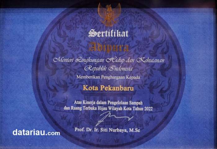 Sertifikat Adipura yang diterima ini bentuk apresiasi dan penilaian bahwa terdapat peningkatan yang cukup tinggi yang diperoleh Pemko Pekanbaru dalam menciptakan Kota Besar Bersih.