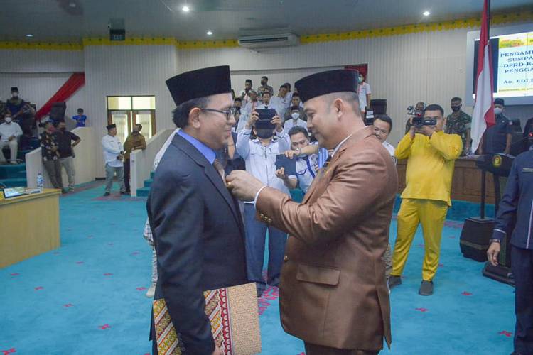 Ketua DPRD Kabupaten Kampar Muhammad Faisal ST, saat menyematkan pin kepada Anggota DPRD Kabupaten Kampar PAW Edi Efrison SPdi MPdi.