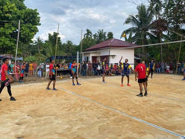 Ketua DPRD Kampar Muhammad Faisal ST saat melakukan servis bola pertama dalam pembukaan Semi Open Turnamen Volly Pauh Muda Club Cup 2 antar desa se-Kabupaten Kampar, Senin (20/2/2023).