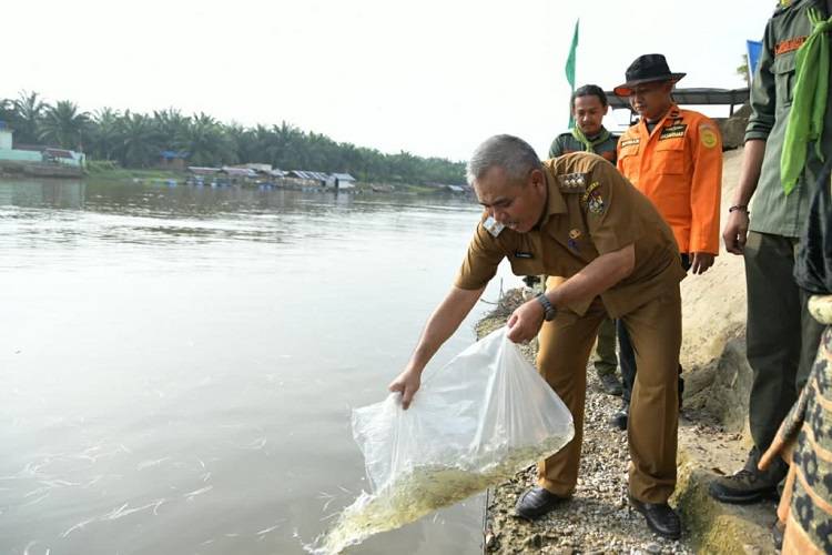 SIAK HULU, datariau.com - Pj Bupati Kampar Dr H Kamsol MM melepas langsung peserta Ekspedisi Susur Sungai Kampar II sekaligus penanaman pohon dan pelepasan bibit ikan di Desa Bulu Cina Kecamatan Siak Hulu, Senin (28/11/2022).
