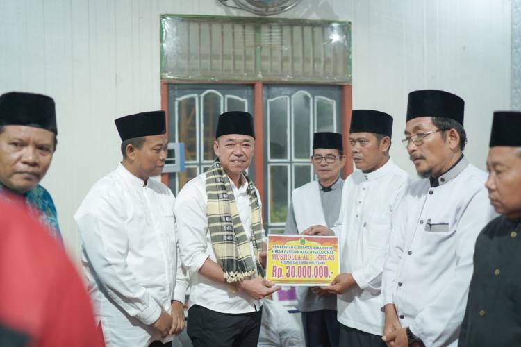 Bupati Rohil dan Wakil Bupati saat menyerahkan bantuan kepada pengurus Mushalla Al Ikhlas Kecamatan Rimba Melintang, Selasa (4/4/2023).