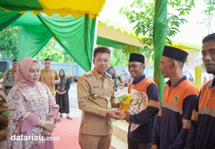 Bupati Rohil disambut saat menghadiri acara syukuran sekaligus pembagian sembako dalam rangka menyambut bulan suci Ramadhan