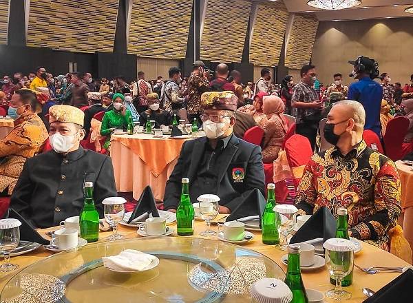 Memasuki Ballroom Hotel Novotel, tampak Wali Kota Aminullah dan kepala daerah lainnya mengenakan pakaian tradisional Lampung lengkap dengan kain sarung tapis dan mengenakan kopiah khas masyarakat Lampung.