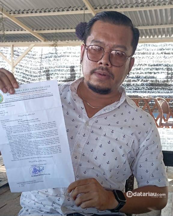 Dia melihat persoalan ini bermula karena adanya perubahan Yayasan Tasik Gemilang menjadi Yayasan Indra Education College, dimana hal tersebut tertuang di dalam surat Yayasan Indra Education College Nomor: 05/YIEC/II/2024 dengan perihal: Dirumahkan sementara berdasarkan Keputusan Menteri Hukum & HAN AHU - 0000234.AH.01.05. Tahun 2024 tentang Persetujuan Yayasan Indra Education College dan berdasarkan Permihonan Notaris Rage Cikal Nugroho SH MKn sesuai akte 07 tanggal 10 Februari 2024 yang dibuat oleh Notaris Rage Cikal Nugroho SH Mk kn.