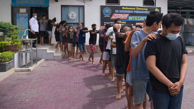 Petugas menggiring mahasiswa yang terbukti menggunakan narkoba di kampus USU Medan, Senin, 11 Oktober 2021. (Foto: Antara)