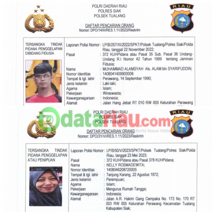 2 Orang di Perawang Siak DPO Polisi Diduga Lakukan Penggelepan Bidang Fidusia dan Penipuan