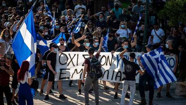 Pengunjuk rasa anti-vaksin melakukan aksi pada Rabu 14 Juli 2021 di depan parlemen Yunani di Athena, dua hari setelah pemerintah mengumumkan vaksinasi Covid-19 wajib untuk semua petugas kesehatan, termasuk mereka yang bekerja di panti jompo.