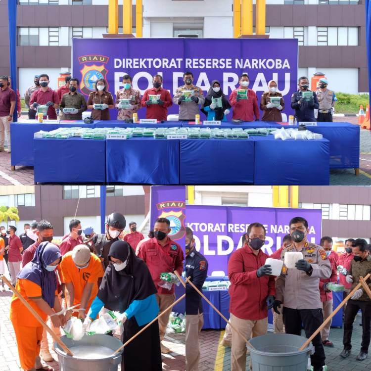 PEKANBARU, datariau.com - Polda Riau memusnahkan sebanyak 86 kg lebih narkoba jenis sabu yang didapat dari enam orang tersangka. Pemusnahan berlangsung di lapangan parkir belakang Mapolda Riau Jalan Pattimura, Kamis (4/11/2021).
