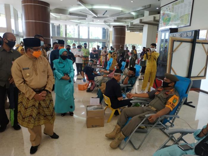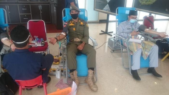 Satpol PP Provinsi Riau ikut berpatisipasi dalam kegiatan aksi donor darah dan tes swab massal yang diadakan Dinas Kesehatan Provinsi Riau di Lobby Gedung 9 Lantai Kantor Gubernur Riau, Selasa pagi (4/8/2020).
