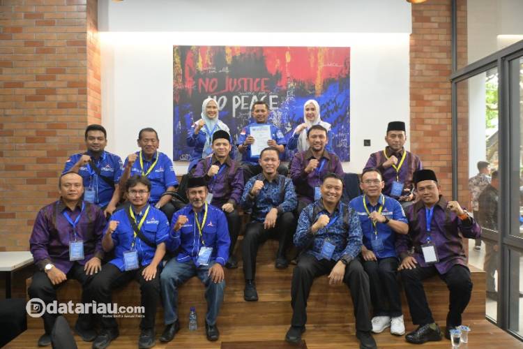 Tungku Azwendi Fajri SE (tengah paling atas) saat menunjukkan SK dukungan Demokrat untuk Agung-Markarius.