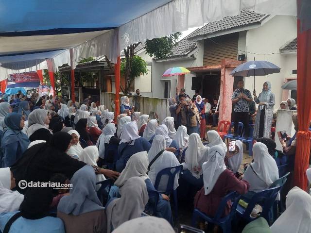 Agung Nugroho yang dipayungi oleh istrinya, Hj Sulastri menyapa ratusan ibu-ibu saat bersilaturahmi dengan Forum Pengajian Ibu-Ibu Cinta Pekanbaru (Forcintaku) di Kecamatan Tuah Madani pada Sabtu (5/10/2024) petang.
