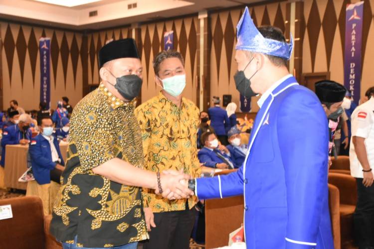 Bupati Kampar H Catur Sugeng Susanto SH MH yang hadir langsung dalam prosesi pelantkan Agung, Catur Sugeng langsung menyalami dan memberikan ucapan selamat memimpin Partai Demokrat Riau lima tahun kedepan.