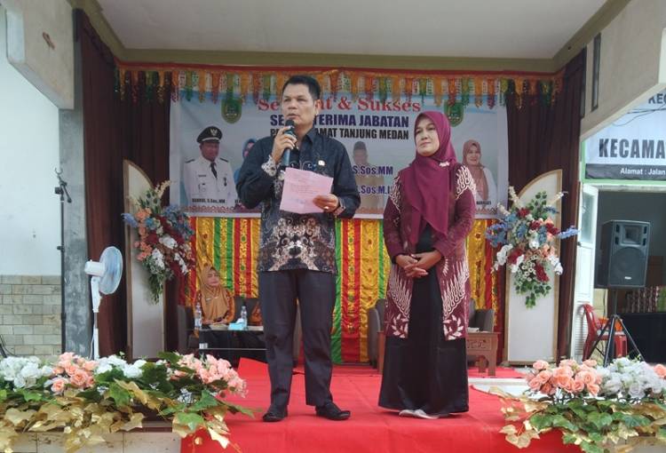 Camat Tanjung Medan Ahendra SSos MIP didampingi istri, saat menyampaikan pidato dalam acara Sertijab.