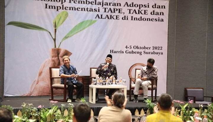 SURABAYA, datariau.com - Bupati Siak, Drs H Alfedri MSi didaulat menjadi pembicara terkait workshop nasional perluasan pengembangan adopsi dan implementasi Transfer Anggaran Kabupaten/Kota berbasis Ekologi (TAKE) di Indonesia, yang ditaja oleh The Asia Foundation Bersama sejumlah NGO Nasional di Surabaya, Rabu (5/10/2022).