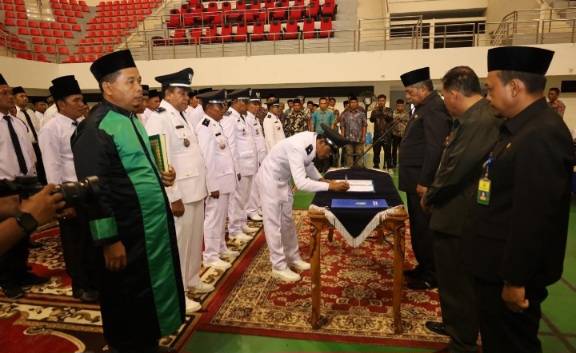 SIAK, datariau.com - Bupati Siak Drs H Alfedri MSi perpanjang masa jabatan 6 kepala kampung dan 52 Badan Permusyawaratan Kampung (Bapekam) Kecamatan Siak, Siak, Selasa (3/9/2024), di gedung Sport Hall.