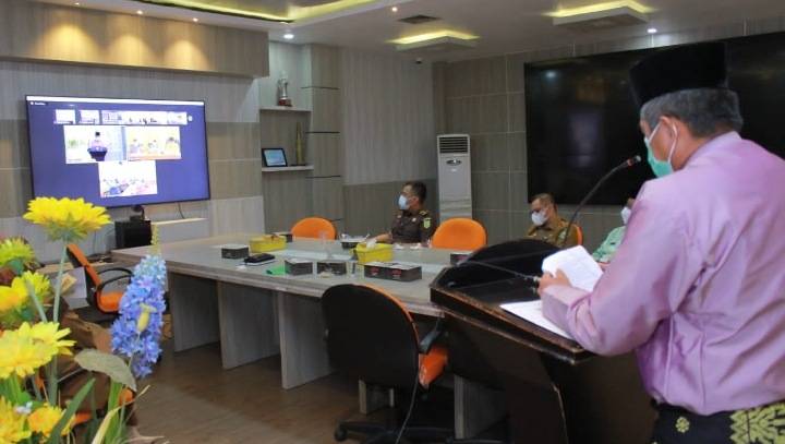 Permintaan persetujuan anggota secara lisan oleh pimpinan rapat paripurna, sekaligus penandatanganan keputusan bersama secara virtual yang dilakukan di ruang Bandar Siak lantai II kantor Bupati Siak, Senin (12/7/2021).
