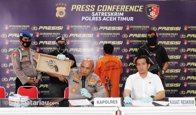 Konferensi pers pengungkapan kasus kepemilikan senpi dan pengancaman.