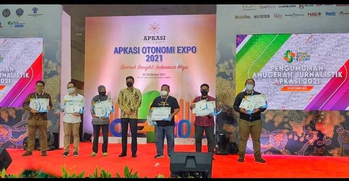 Penyerahan penghargaan juara karya jurnalis melalui Anugerah Jurnalistik APKASI 2021 di Jakarta.