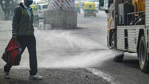 Sebuah kendaraan memercikkan air di jalan untuk menghilangkan debu di bawah kondisi kabut asap tebal di New Delhi pada 12 November 2021. (Foto: AFP)