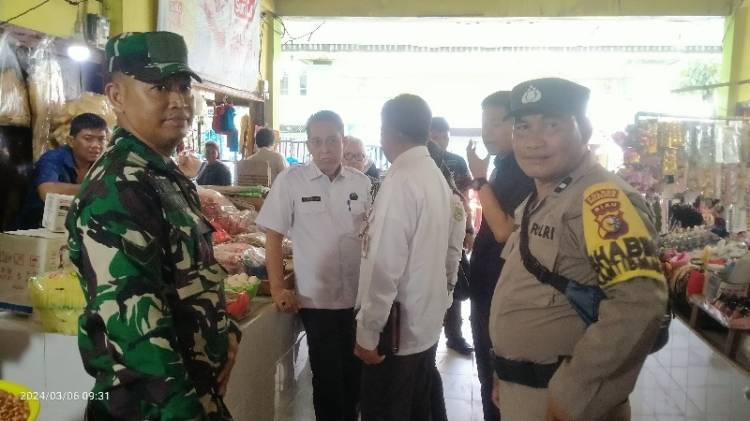 ROHIL, datariau.com - Menjelang bukan suci Ramadhan, Asisten II Bidang Ekonomi Rahmatul Zamri bersama Kepala Dinas Perindustrian Perdagangan dan Pasar (Disperindagsar) Rokan Hilir (Rohil), Mursal beserta staf turun ke pasar Datuk Rubiah Jalan Sumatera Kelurahan Bagan Timur Kecamatan Bangko, Rohil untuk memantau harga kebutuhan pokok, Rabu (6/3/2023).