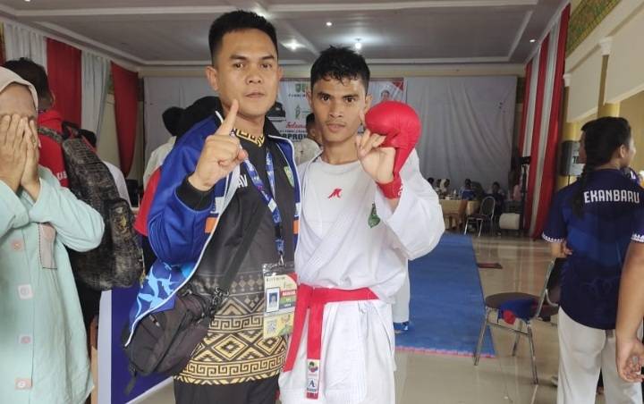 Atlet karate Kabupaten Siak Dimas Adi Saputro meraih medali emas pertama di ajang Porprov Riau ke-X di Kuansing.