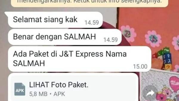 Di sini pelaku menyebut bahwa file yang dikirim adalah foto paket yang hendak diantarkan. Pelaku menamai file berbahaya tersebut dengan "Lihat Foto Paket" untuk mendorong korban mengklik file yang dikirimkan.