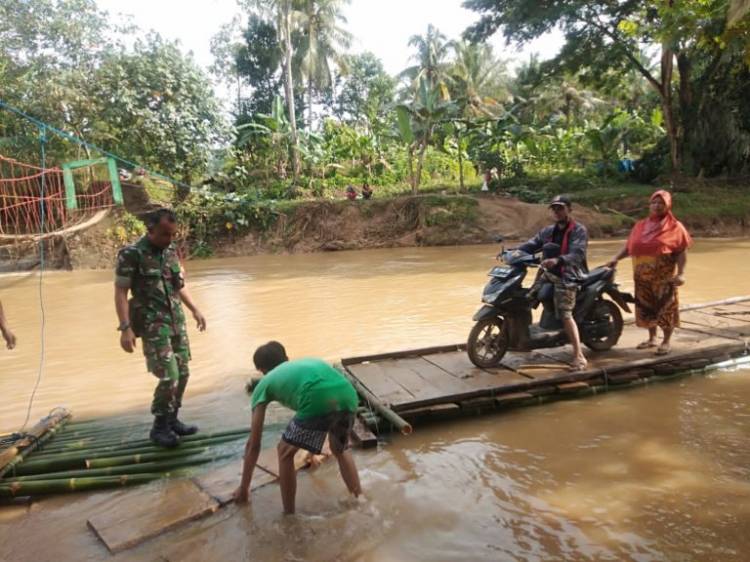 Babinsa Dua Pekon Ikut Bantu Masyarakat, Jembatan Gantung di Pekon Madaraya Putus akibat Arus Sungai Meluap