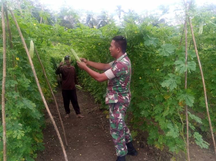 INHU, datariau.com - Babinsa Koramil 05/Prp Kodim 0302/INHU, Kopda Riswan Manurung melaksanakan kegiatan pendampingan dan membantu petani memetik sayur pare untuk dijual kepasar di Kelurahan Batur Rijal Hilir, Kecamatan Peranap, Kabupaten Indragiri Hulu-Riau, Rabu (22/02/2023)