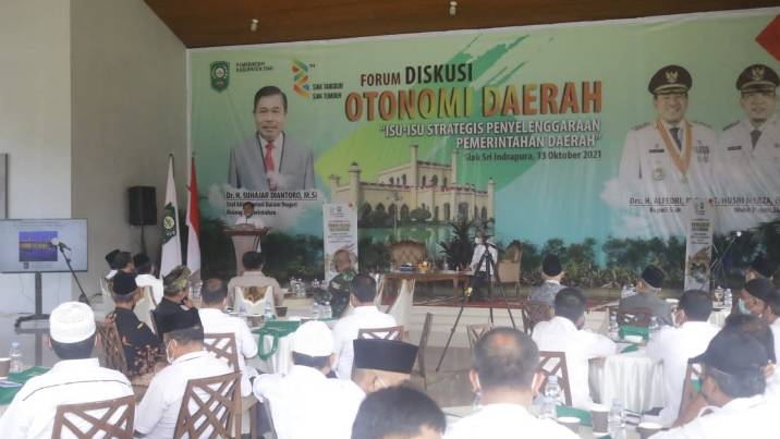 SIAK, datariau.com - Bupati Siak Drs H Alfedri MSi membuka secara resmi Forum Diskusi Otonomi Daerah bertemakan "Isu-isu Strategis Penyelenggaraan Pemerintah Daerah". Forum Diskusi Otonomi Daerah ini di gelar bersempena HUT Ke - 22 Kabupaten Siak, bertempat di Balairung Datuk Empat Suku Komplek Perumahan Abdi Praja, Rabu (13/10/2021).