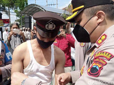 Kapolres Purworejo melucuti pakaian dinas Aipda AL dalam upacara PTDH Aipda AL di Mapolres Purworejo, Selasa (8/11/2022) Foto: Rinto Heksantoro/detikJateng