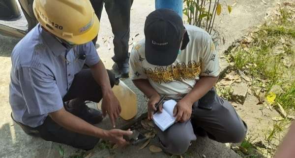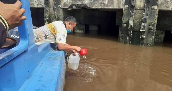 Pengambilan sample air di hilir aliran sungai Siak Kecamatan Tualang.