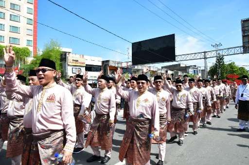 Bupati Bengkalis Kasmarni bersama 2500 penggembira mengikuti Pawai Ta'aruf MTQ ke-42 tingkat Provinsi Riau, di Kota Dumai, Ahad (21/4/2024).