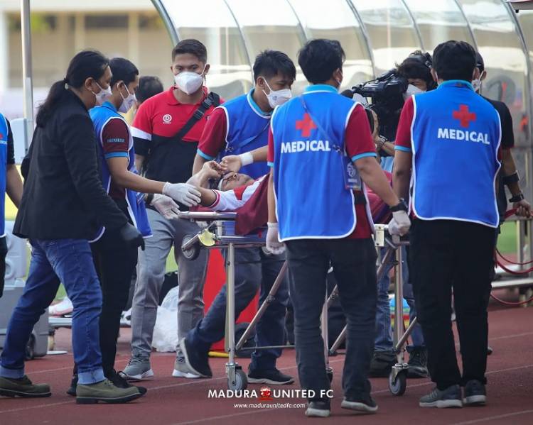 Kevy tengah dibawa menuju rumah sakit akibat insiden adu kepala dengan bek dari PSS Sleman saat menjalani laga babak pertama Madura United vs PSS Sleman di BRI Liga 1, Sabtu (25/9/2021)