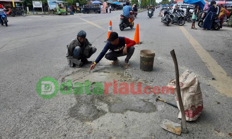 Bripka Arya Sudarsa dan Karang Taruna Kelurahan Perawang Tambal Jalan Berlobang Depan Pos Indonesia