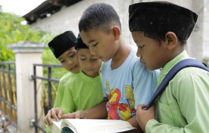 Siswa sekolah saat membaca buku pada perpustakaan keliling pada Program Bujang Kampung di Marempan Hulu.