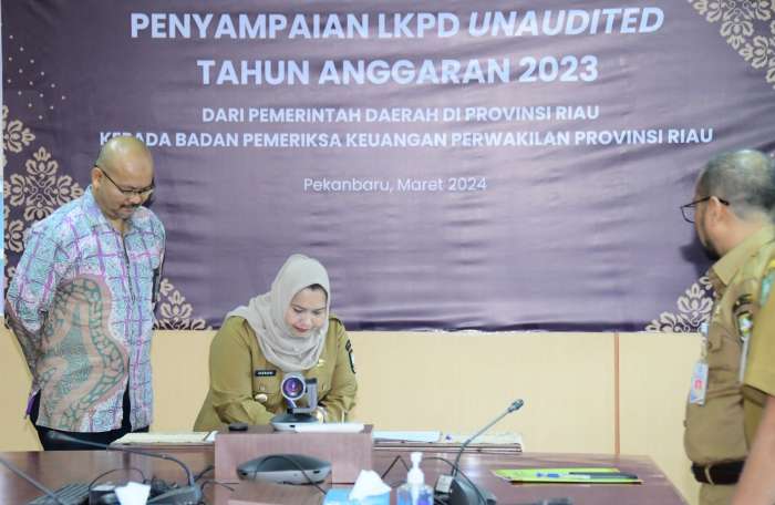 PEKANBARU, datariau.com - Bupati Bengkalis Kasmarni menyerahkan Laporan Keuangan Pemerintah Daerah (LKPD) Unaudited (laporan yang belum diaudit) tahun 2023 kepada Badan Pemeriksa Keuangan (BPK) RI Perwakilan Provinsi Riau di Kantor BPK Perwakilan Provinsi Riau, Jalan Sudirman Pekanbaru, Selasa (26/3/2024).