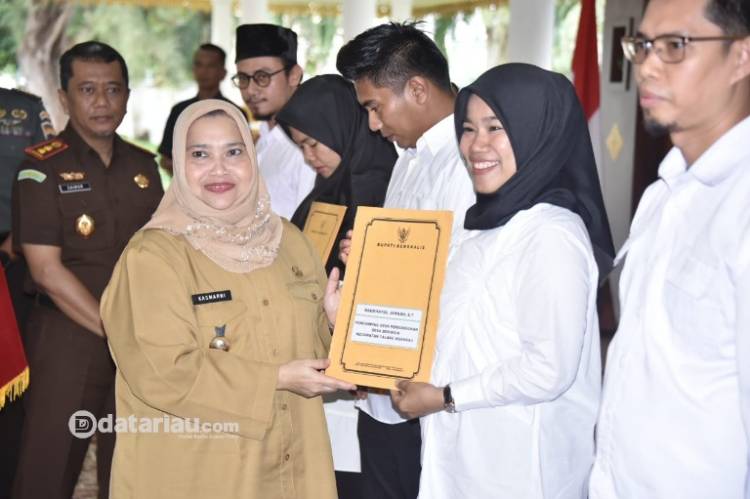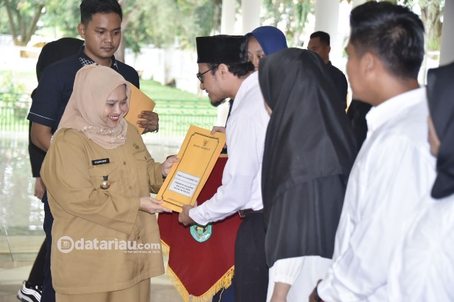 SK tersebut diserahkan kepada Bupati Bengkalis Kasmarni secara simbolis kepada tenaga Pendamping Perwakilan Desa/Kelurahan dari masing-masing kecamatan Kabupaten Bengkalis.