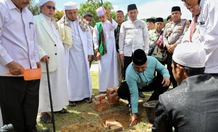 Bupati Siak Drs H Alfedri MSi beserta Murobby Ruhina KH Abdullah Mukhtar pendiri dan pengasuh Ponpes An-Nizom Sukabumi, Provinsi Jawa Barat, Pimpinan Pondok Pesantren Baiturrahman An-Nizom, Pimpinan Bank Riau Kepri Syariah melaksanakan peletakan batu pertama pembangunan 2 ruang kelas bantuan Bank Riau Kepri Syariah.(***)