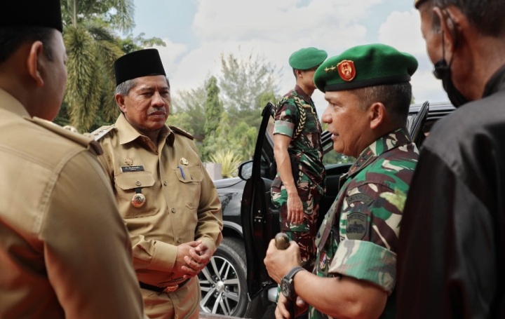 SIAK, datariau.com - Kunjungan Kerja Panglima Kodam (Pangdam) I/Bukit Barisan Mayjen TNI Ahmad Daniel Chardin ke Kabupaten Siak, disambut langsung oleh Bupati Siak, Drs H Alfedri, MSi di dampingi Wakil Bupati Siak H Husni Merza, BBA MM di Balairung Datuk Empat Suku Komplek Perumahan Abdi Praja, Senin (23/5/2022).